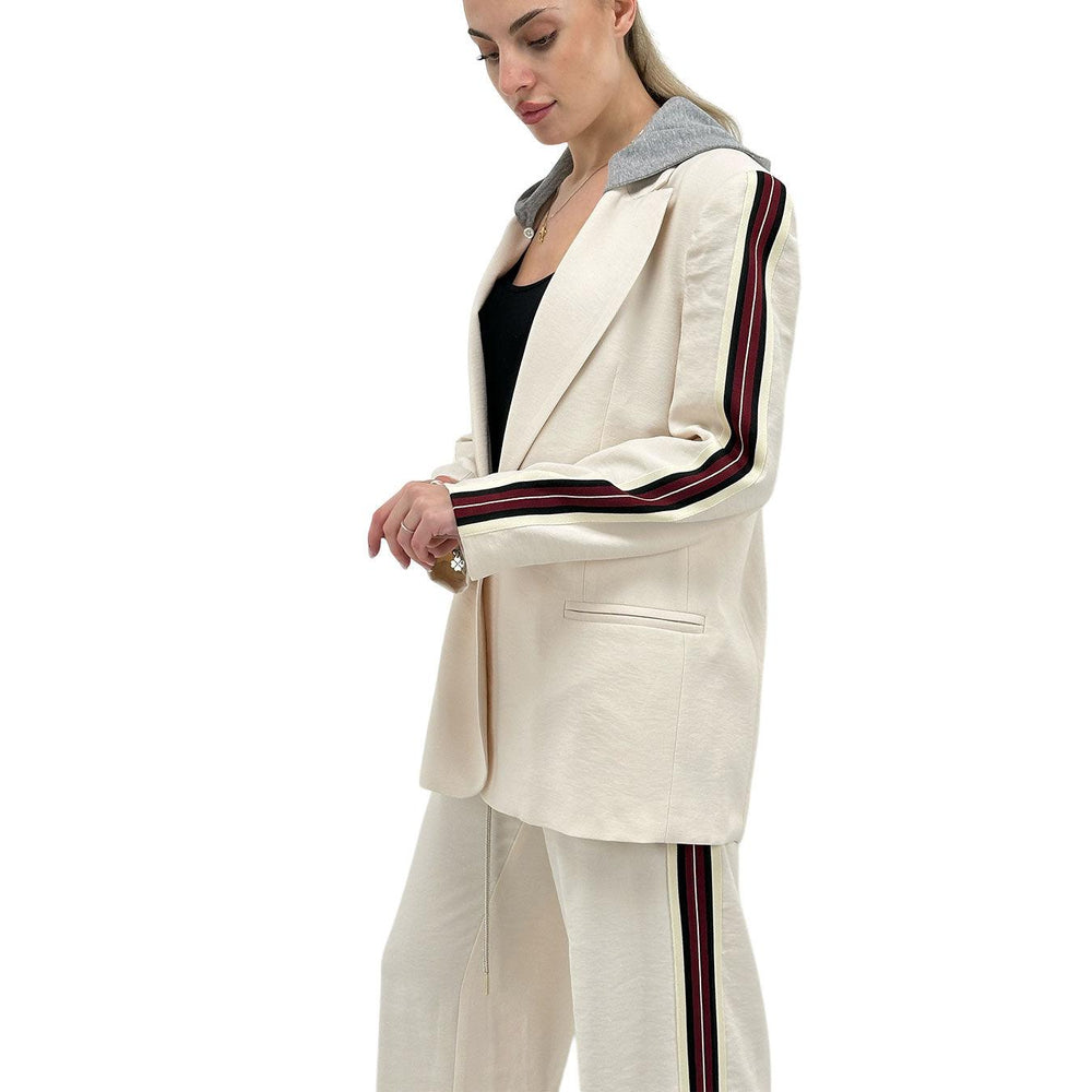 Kontatto giacca sportiva donna, realizzata in tessuto misto, casual e versatile. Caratterizzata da collo revers con cappuccio colore grigio, chiusura monopetto con un solo bottone e lunghezza a fianchi per uno stile contemporaneo. Manica lunga con bande a contrasto. Colore avorio. Composizione: 90% viscosa, 10% poliestere. Vestibilità regolare.