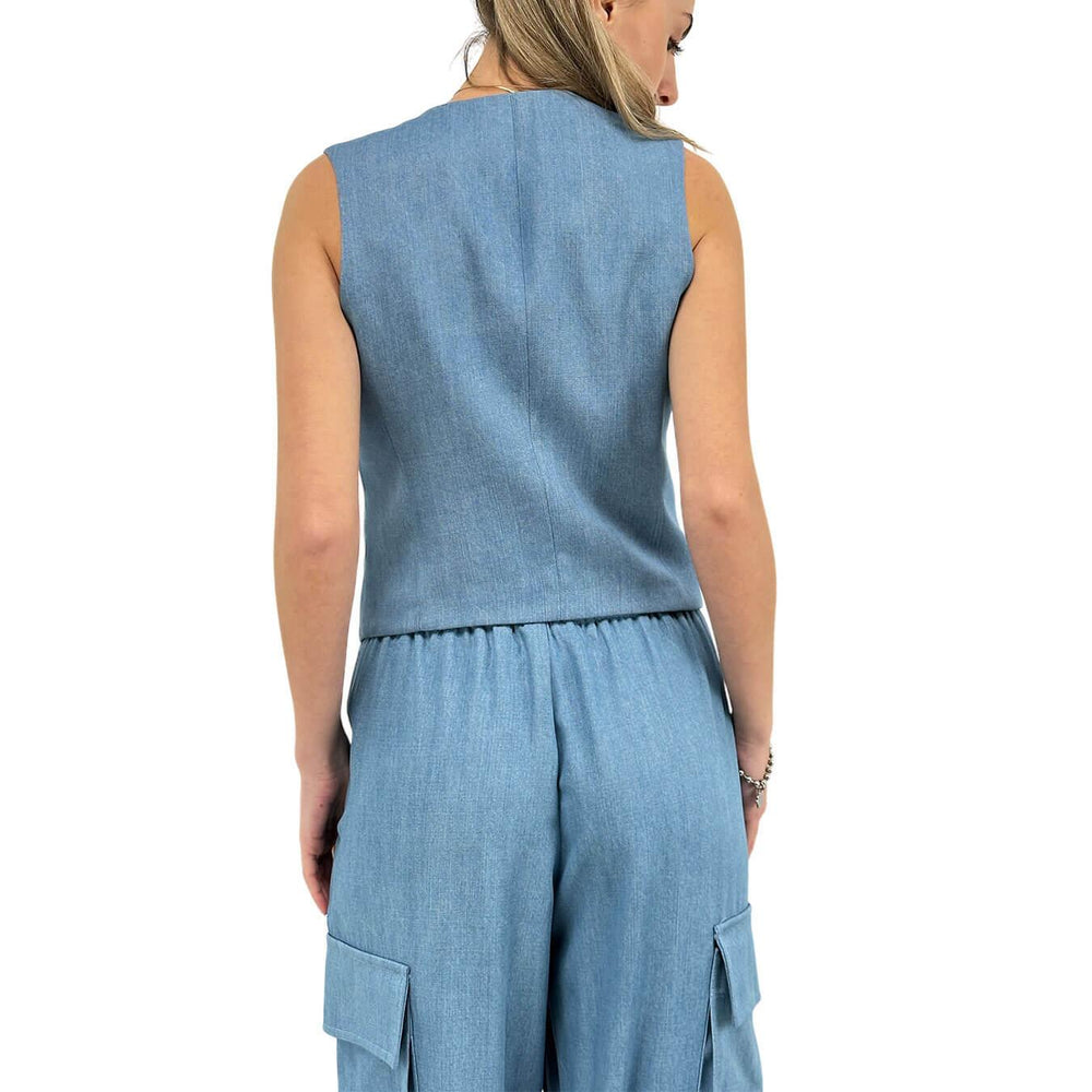 Kontatto gilet donna, realizzato in tessuto lycra, colore azzurro, modello monopetto con scollo a V e chiusura a bottoni. Dotato di due tasche a filo sul davanti, è perfetto per completare look casual o eleganti, aggiungendo un tocco moderno e raffinato. Composizione: 100% lycra.