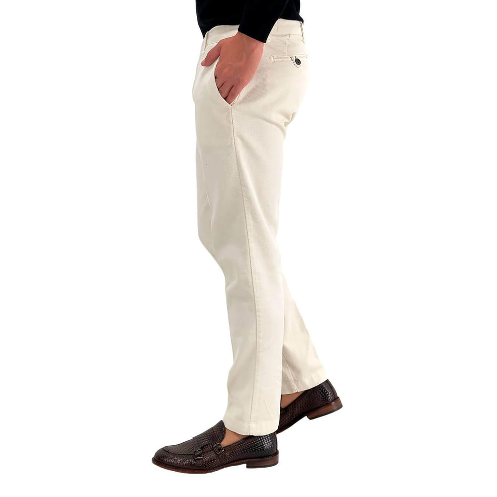 Moro pantaloni Chino uomo, realizzato in cotone leggermente elasticizzato per il massimo comfort, vita media e gamba asciutta per uno stile moderno. Tasche frontali funzionali, chiusura zippata con bottone per una vestibilità sicura. Colore avorio. Composizione: 98% cotone, 2% elastan. Vestibilità regolare.